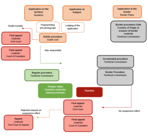 Italy Table of contents Statistics Overview of the legal framework Overview of the main changes since the previous report update Asylum Procedure General Flow chart Types of procedures List of authorities intervening in each stage of the procedure Number of staff and nature of the first instance authority Short overview of the asylum procedure Access to the procedure and registration Access to the territory and push backs Preliminary checks of third country nationals upon arrival Hotspots Registration of the asylum application Procedures Regular procedure Dublin Admissibility procedure Border procedure (border and transit zones) Accelerated procedure National protection statuses and return procedure Immediate procedure Guarantees for vulnerable groups Identification Special procedural guarantees Use of medical reports Legal representation of unaccompanied children Subsequent applications The safe country concepts Safe country of origin Safe third country First country of asylum Information for asylum seekers and access to NGOs and UNHCR Provision of information on the procedure Access to NGOs and UNHCR Differential treatment of specific nationalities in the procedure Reception Conditions Short overview of the reception system Access and forms of reception conditions Criteria and restrictions to access reception conditions Forms and levels of material reception conditions Reduction or withdrawal of reception conditions Freedom of movement Housing Types of accommodation Conditions in reception facilities Employment and education Access to the labour market Access to education Health care Special reception needs of vulnerable groups Information for asylum seekers and access to reception centres Provision of information on reception Access to reception centres by third parties Differential treatment of specific nationalities in reception Detention of Asylum Seekers General Legal framework of detention Grounds for detention Alternatives to detention Detention of vulnerable applicants Duration of detention Detention conditions Place of detention Conditions in detention facilities Access to detention facilities Procedural safeguards Judicial review of the detention order Legal assistance for review of detention Differential treatment of specific nationalities in detention Content of International Protection Status and residence Residence permit Civil registration Long-term residence Naturalisation Cessation and review of protection status Withdrawal of protection status Family reunification Criteria and conditions Status and rights of family members Movement and mobility Freedom of movement Travel documents Housing Employment and education Access to the labour market Access to education Social welfare Health care ANNEX I – Transposition of the CEAS in national legislation